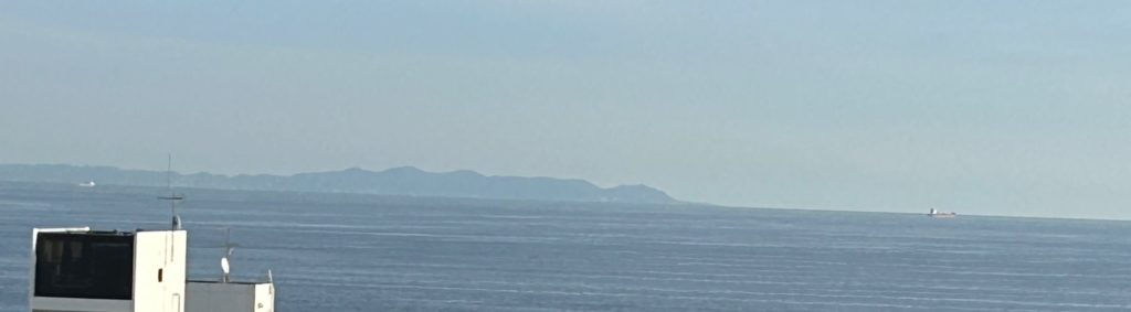 東京湾口の房総の先端を見た風景です。観音様が仰向けに寝ているようにに見えるので、野比の人たちは「寝観音」と呼んでいます。