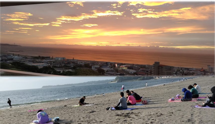 美しい朝焼けを見た後 青い空と海を見ながら三浦海岸でヨガ
