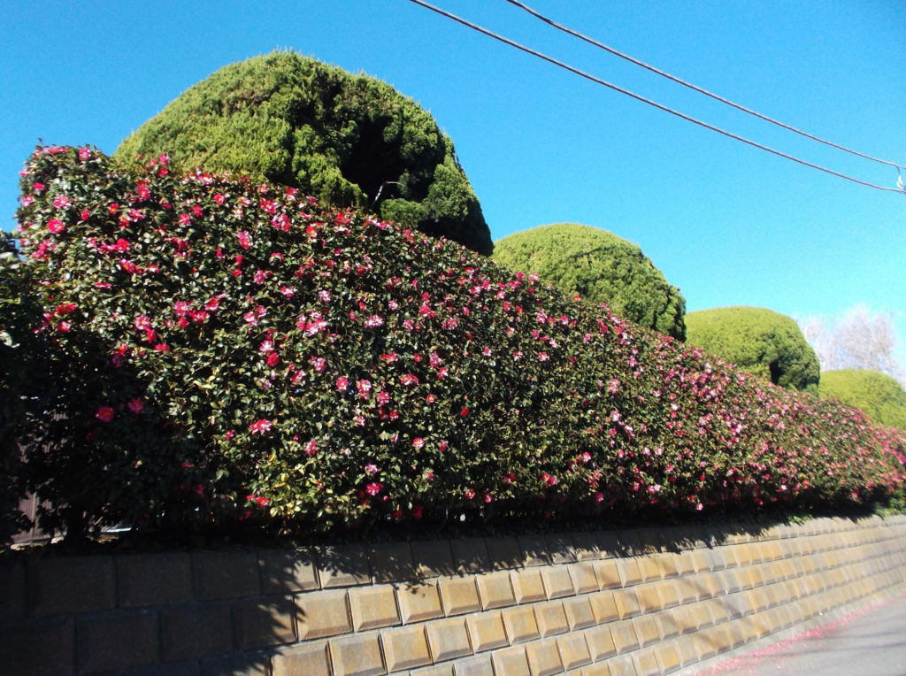 根岸小学校校門の入り口に毎年椿の生垣に花がのぞいています